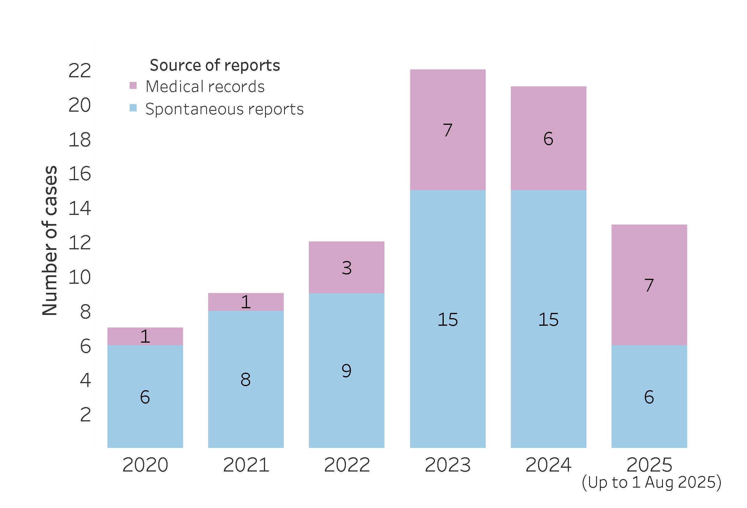 Figure 1. Local cases of metoclopramide-induced extrapyramidal side effects among paediatric patients aged 18 years and below in the past five years (January 2020 – August 2025)